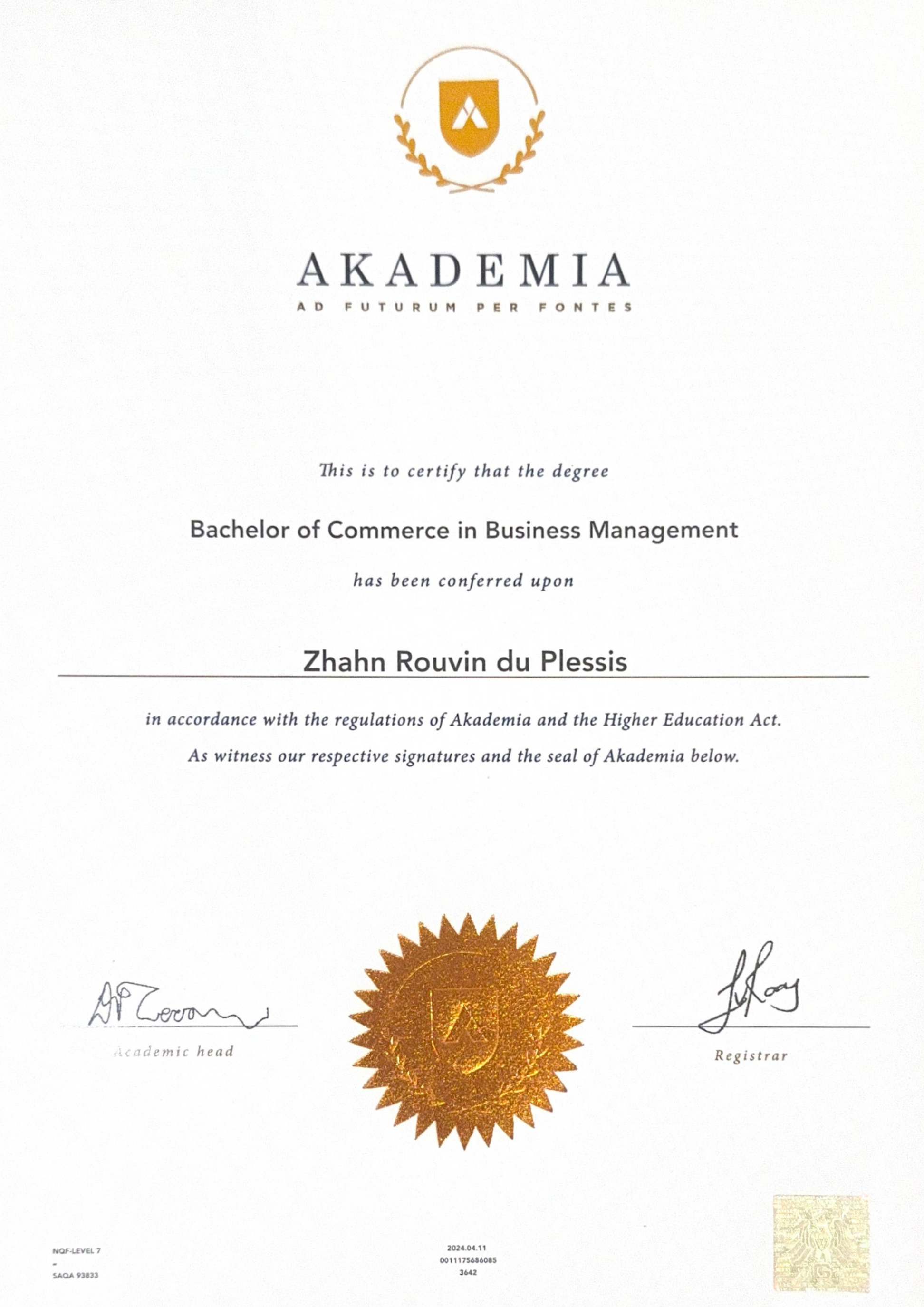 Zhahn holds a Bachelor of Commerce in Business Management from Akademia University, providing a strong foundation in business strategy, financial analysis, and decision-making.
